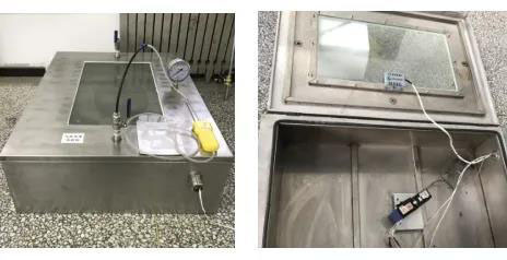 (1)試驗(yàn)方案準(zhǔn)備IP67的熱失控氣體采集箱(帶兩個(gè)球閥、一個(gè)壓力表),用兩個(gè)300W加熱片對(duì)120 A·h磷酸鐵鋰電池進(jìn)行加熱,在進(jìn)行加熱試驗(yàn)時(shí),需要使用夾具將鋰電池和加熱片夾緊,防止電池在加熱的過程中由于電池殼體膨脹變形導(dǎo)致加熱片與電池殼體不能緊密連接,加熱片的熱量不能充分傳遞至電池,不能觸發(fā)電池?zé)崾Э?,?dǎo)致試驗(yàn)失敗;在加熱片與電池的接觸面及電池背面部署溫度探測(cè)器;在實(shí)驗(yàn)箱頂部部署動(dòng)力電池?zé)崾Э靥綔y(cè)裝置,并使用監(jiān)控軟件實(shí)時(shí)監(jiān)測(cè)探測(cè)控制器的氣體、煙霧和溫度數(shù)據(jù),并對(duì)工程數(shù)據(jù)進(jìn)行存儲(chǔ);電池放入采集箱,電池加熱相關(guān)準(zhǔn)備工作完成后,關(guān)閉采集箱門,鎖死箱門,關(guān)閉兩個(gè)球閥;部署攝像機(jī),對(duì)整個(gè)試驗(yàn)過程進(jìn)行錄制,加熱過程中,溫度數(shù)據(jù)、控制器的傳感器數(shù)據(jù)及錄像時(shí)間需要校時(shí);開始加熱電池工作,待檢測(cè)到電池防爆閥打開后,關(guān)閉加熱電源;打開球閥,開啟取樣泵,把取樣泵的氣體排放至安全區(qū)域,工作兩分鐘;把采氣袋接到采樣泵排氣管上,打開采氣袋閥門,開始取氣;取氣結(jié)束后,先關(guān)閉采樣泵,再關(guān)閉采氣袋閥門,最后關(guān)閉箱體上球閥。熱失控氣體采集箱整體布置見圖3。