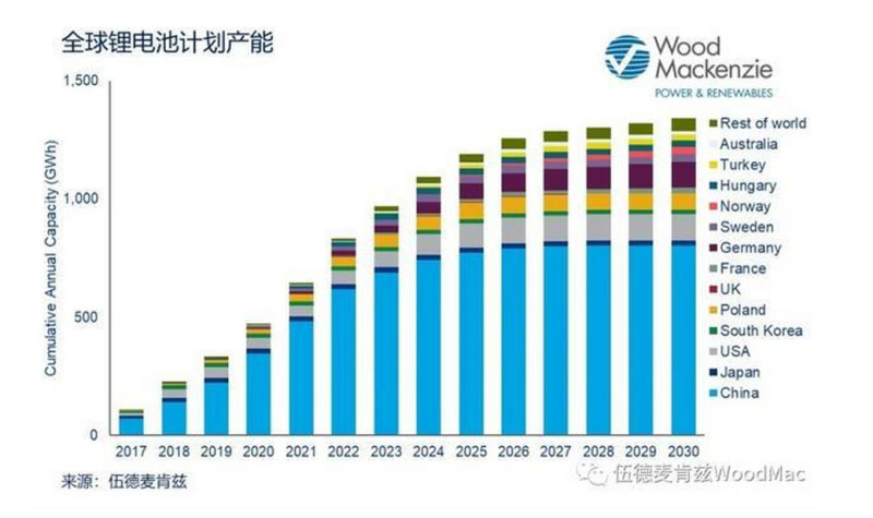 原標題:伍德麥肯茲:預計2030年,中國鋰電池產(chǎn)能將達到800GWh