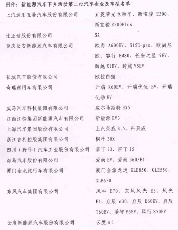 新能源汽車下鄉(xiāng)活動第二批汽車企業(yè)及車型名單