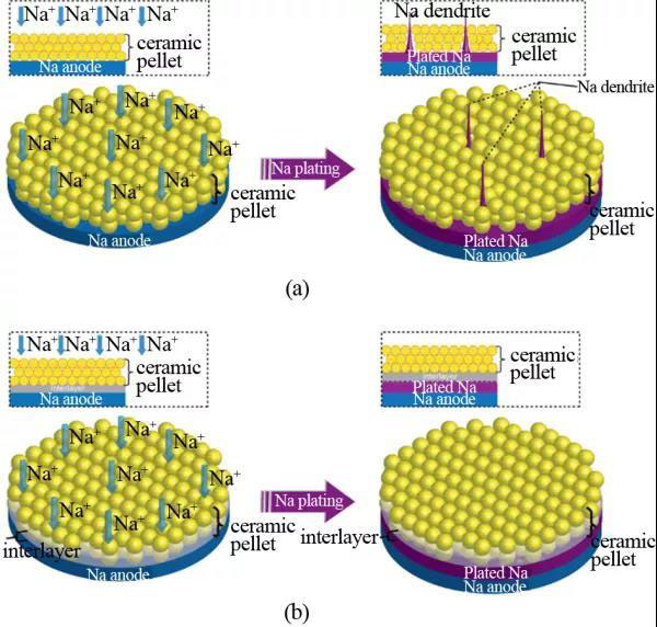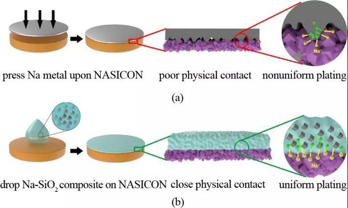 圖5 金屬鈉負(fù)極和NASICON固體電解質(zhì)之間物理接觸的圖解:(a) 金屬鈉負(fù)極和NASICON固體電解質(zhì)之間差的接觸會(huì)導(dǎo)致不均勻的沉積和電池短路;(b) 金屬鈉-SiO2復(fù)合物和NASICON固體電解質(zhì)之間緊密接觸可穩(wěn)定固-固界面