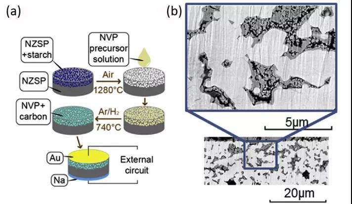 圖3 (a) 全固態(tài)電池制備步驟;(b) Na3V2(PO4)3 正極(暗)在Na3.4Zr2Si2.4P0.6O12(亮)片中滲透截面的掃描電鏡圖片