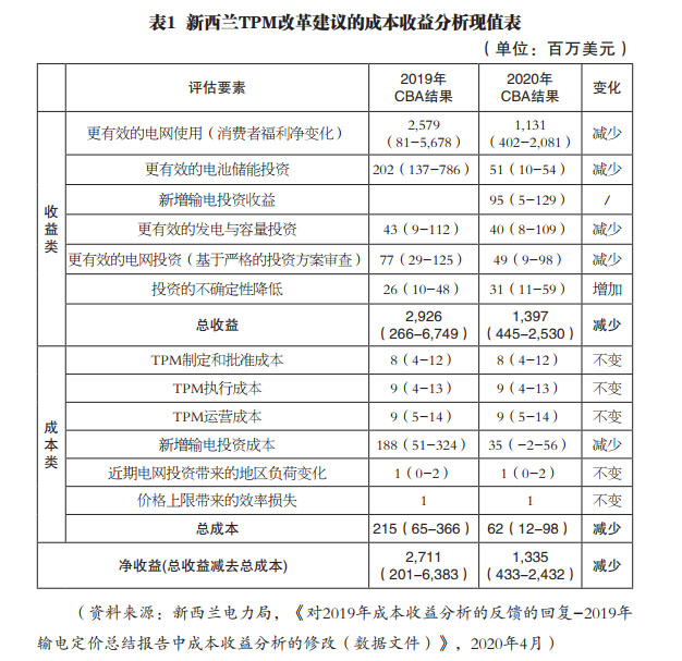 新西蘭電力局針對新TPM于2019年7月和2020年4月進行了兩次成本收益分析。CBA以現(xiàn)有政策為基準線,估算了新TPM方案所產(chǎn)生的6項成本和6項收益變化的中值及變化范圍,并計算了相應的凈收益值,如表1所示,表中數(shù)據(jù)為各種估值的中位數(shù),括號內(nèi)數(shù)據(jù)為估值的最小與最大值。有關結果表明,不管主觀要素還是客觀要素,也不管不同主體采用不同方法對不同成本要素和收益要素的估值存在多大差異,對政策進行成本與收益的價值評估是可行的。實際上,比評估結果更重要的是,CBA加深了政府對政策的全面把握,也利于政策批準后的有效執(zhí)行。