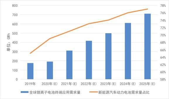 圖1 2020-2025年全球鋰離子電池需求量預測