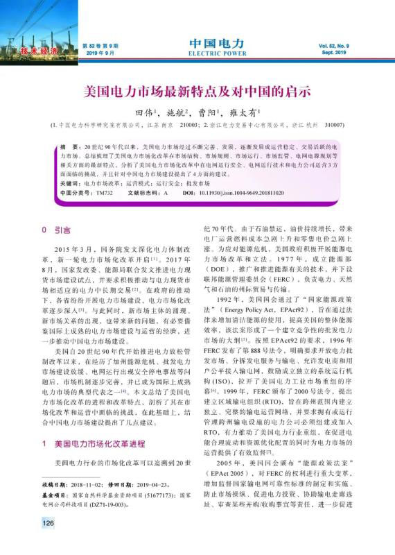 20世紀90年代以來,美國電力市場經(jīng)過不斷完善、發(fā)展,逐漸發(fā)展成運營穩(wěn)定、交易活躍的電力市場??偨Y(jié)梳理了美國電力市場化改革在市場結(jié)構(gòu)、市場規(guī)則、市場運行、市場監(jiān)管、電網(wǎng)電源規(guī)劃等相關(guān)方面的最新特點,分析了美國電力市場化改革中在電網(wǎng)運行安全、電網(wǎng)運行技術(shù)和電力公司運營3方面面臨的挑戰(zhàn),并且針對中國電力市場建設(shè)提出了4方面的建議。