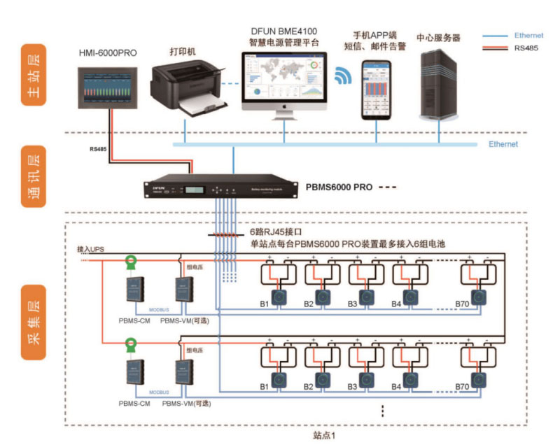 分布式的在線電池檢測(cè)系統(tǒng)由采集層的傳感器,通訊層的收斂電池網(wǎng)關(guān),以及主站層的系統(tǒng)構(gòu)成。