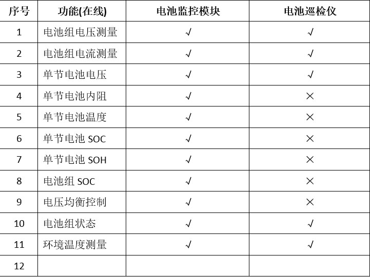 另外,在一些常見的后備電源系統(tǒng)中,有可能會(huì)配備傳統(tǒng)的電池巡檢儀。電池巡檢儀雖然也能在線測(cè)量,但它主要測(cè)量點(diǎn)對(duì)象是單體電池電壓,而蓄電池的內(nèi)阻、溫度、SOC和SOH這些核心參數(shù),卻無法及時(shí)得到體現(xiàn)。如下圖: