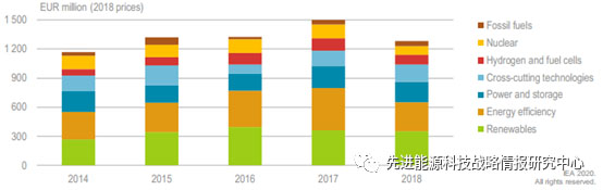 能源技術(shù)創(chuàng)新,包括研發(fā)(R&D)是歐洲“能源聯(lián)盟”的五大支柱之一。近年來,歐盟一直在增加對能源研發(fā)的資助,“地平線歐洲”計劃在氣候、能源和交通方面投入150億歐元,在氣候行動方面投入350億歐元。2018年“地平線2020”能源預(yù)算的一半用于可再生能源(占總量的27%)和能源效率(占23%)(圖1)。其中可再生能源的資金分配主要包括太陽能、風(fēng)能、生物能源、地?zé)岷秃Q竽茉搭I(lǐng)域。而對能效技術(shù)的資助中,約三分之一用于工業(yè),其次用于建筑、交通和其他能效領(lǐng)域。2018年,電力和儲能及其他交叉技術(shù)合計占能源研發(fā)總量的30%自2016年以來,用于交叉研究的資金在總預(yù)算中的份額翻了一番。