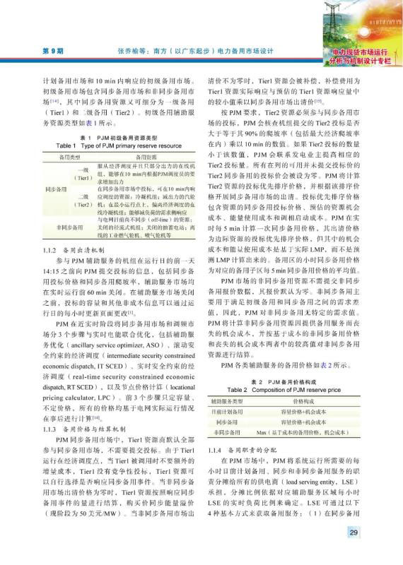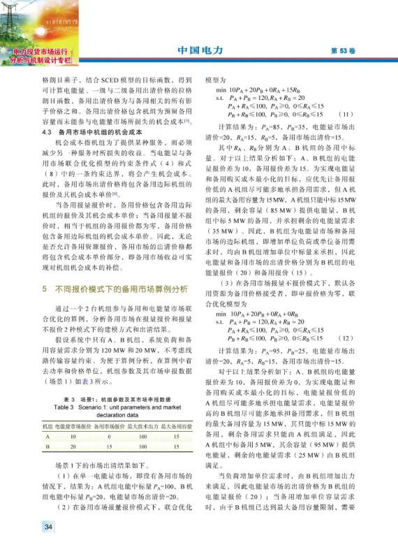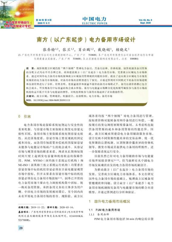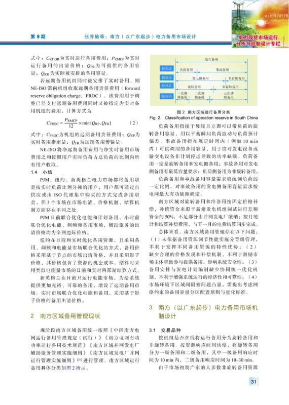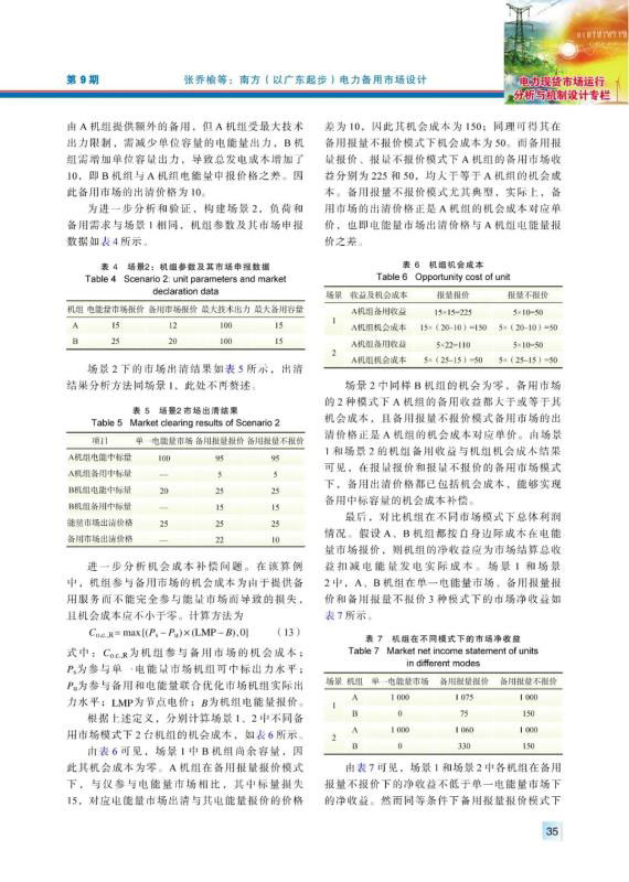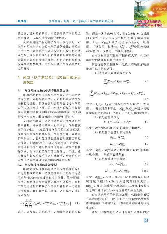 現(xiàn)階段南方區(qū)域仍按“兩個細(xì)則”管理電力備用,其備用品種、價格機(jī)制、結(jié)算機(jī)制及備用資源的分配方式均有不盡合理之處,亟須建設(shè)南方(以廣東起步)電力備用市場,完善南方區(qū)域電力市場體系。通過對國外電力備用市場機(jī)制和南方區(qū)域備用管理現(xiàn)狀問題的分析,提出了適應(yīng)南方區(qū)域電力市場發(fā)展現(xiàn)狀的電力備用市場機(jī)制,對備用市場出清模型進(jìn)行了探究,并通過算例對不同模式下的備用市場建模和出清結(jié)果進(jìn)行了分析,結(jié)果表明,在報量報價和報量不報價的備用市場模式下,備用出清價格都已包含機(jī)會成本,可實(shí)現(xiàn)備用中標(biāo)容量的機(jī)會成本補(bǔ)償,備用與電能量市場聯(lián)合優(yōu)化機(jī)制可確保參與備用市場的機(jī)組收益不低于只參與電能量的情形,對機(jī)組積極參與備用市場起到了正向激勵作用。