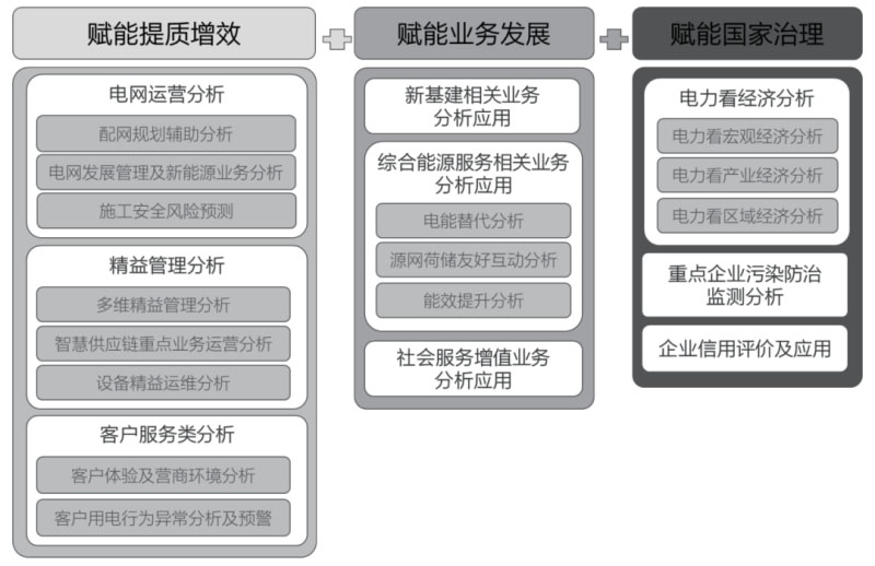 為了更好地發(fā)揮數(shù)據(jù)要素的作用,大數(shù)據(jù)應(yīng)用必須向系統(tǒng)化、專業(yè)化、規(guī)?;较虬l(fā)展,從能源電力企業(yè)內(nèi)外部環(huán)境與市場需求來看,圍繞大數(shù)據(jù)應(yīng)用在存量優(yōu)化、增量創(chuàng)新、公益服務(wù)三個(gè)領(lǐng)域的作用發(fā)揮,大數(shù)據(jù)應(yīng)用的業(yè)務(wù)規(guī)劃將聚焦在“賦能提質(zhì)增效”“賦能業(yè)務(wù)發(fā)展”“賦能國家治理”三大核心領(lǐng)域?;谀茉措娏?shù)據(jù)價(jià)值密度高、實(shí)時(shí)準(zhǔn)確性強(qiáng)、覆蓋范圍廣等特點(diǎn),重點(diǎn)開展“3+3+3”的典型企業(yè)級大數(shù)據(jù)應(yīng)用。