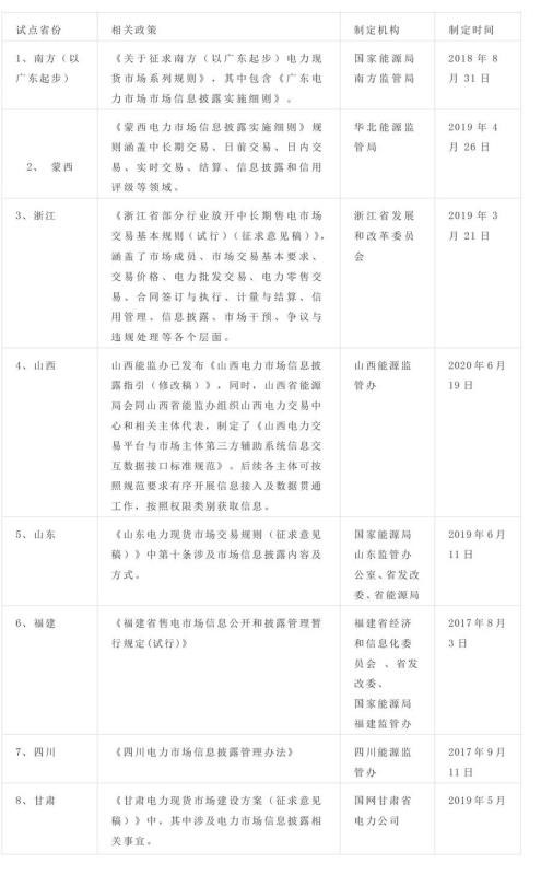 經(jīng)盤(pán)點(diǎn),在8個(gè)現(xiàn)貨市場(chǎng)試點(diǎn)省份,均已有相關(guān)規(guī)則涉及交易信息的披露,部分省份是在現(xiàn)貨交易系列規(guī)則中作為獨(dú)立章節(jié)列出,部分省份則是單獨(dú)制定了電力市場(chǎng)信息披露管理辦法,詳見(jiàn)下表: