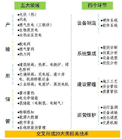(一)以客戶需求為出發(fā)點(diǎn),動(dòng)態(tài)構(gòu)建綜合能源服務(wù)技術(shù)體系,強(qiáng)化技術(shù)提升目標(biāo)導(dǎo)向。從能源全產(chǎn)業(yè)鏈看,綜合能源服務(wù)技術(shù)可以劃分為“產(chǎn)、輸、用、儲(chǔ)、管”五大領(lǐng)域;從項(xiàng)目全生命周期看,各領(lǐng)域均包含設(shè)備制造、方案設(shè)計(jì)、建設(shè)管理、運(yùn)營維護(hù)四個(gè)主要環(huán)節(jié),合計(jì)交叉形成20大類相關(guān)技術(shù)(5×4)。技術(shù)體系應(yīng)結(jié)合地域特點(diǎn)、行業(yè)發(fā)展階段等進(jìn)行動(dòng)態(tài)優(yōu)化調(diào)整。