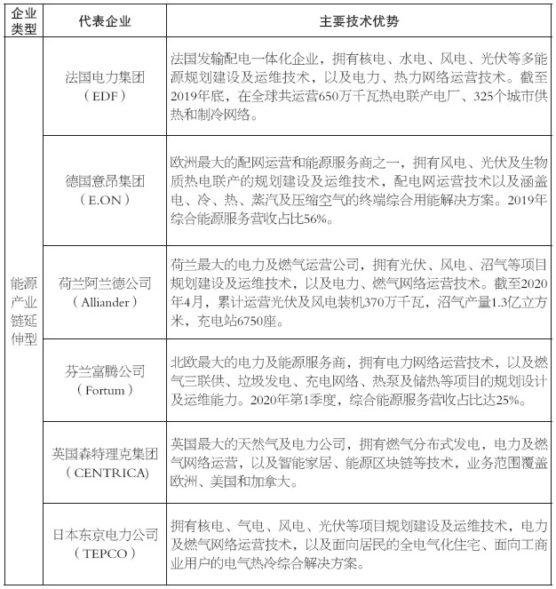 綜合能源服務(wù)既是資金密集型產(chǎn)業(yè),也是技術(shù)密集型產(chǎn)業(yè),行業(yè)頭部企業(yè)均注重以技術(shù)優(yōu)勢(shì)贏得市場(chǎng)份額。國內(nèi)方面,發(fā)電、燃?xì)?、?jié)能環(huán)保、互聯(lián)網(wǎng)等公司紛紛依托自身技術(shù)稟賦搶占市場(chǎng)。其中,能源產(chǎn)業(yè)鏈延伸型企業(yè)依托能源電力技術(shù)優(yōu)勢(shì),向產(chǎn)業(yè)鏈上下游延伸,具體可分為“以電切入”和“以氣切入”兩類;信息領(lǐng)域跨界能源型企業(yè)利用“大云物移智鏈”技術(shù)優(yōu)勢(shì)和互聯(lián)網(wǎng)運(yùn)營管理經(jīng)驗(yàn),全方位滲透能源電力全產(chǎn)業(yè)鏈,開展智慧能源管理、購售電交易等業(yè)務(wù)。