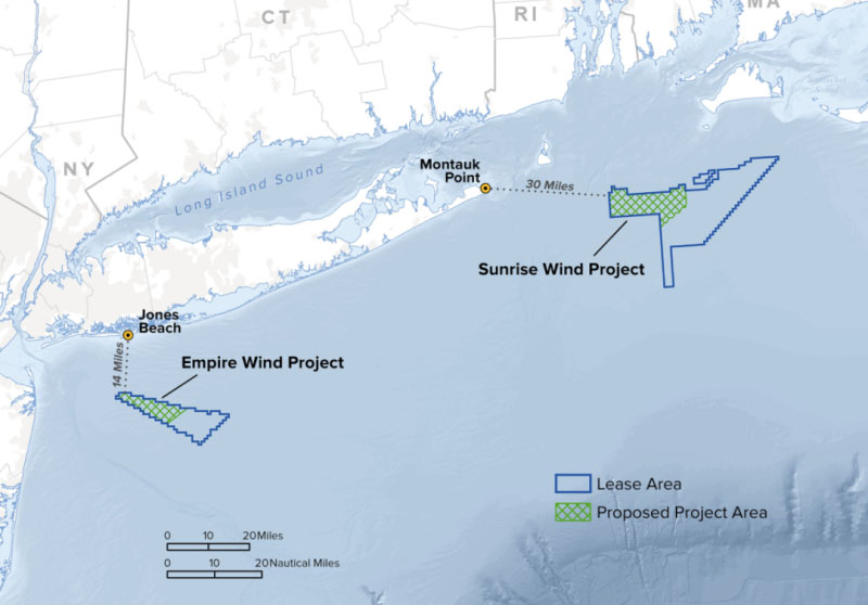 Empire Wind海上風(fēng)電項目,預(yù)計裝機(jī)容量2GW,位于紐約市長島東南15-30英里附近海域,是Equinor在美國海上風(fēng)電的第一筆大投資。項目占地80000英畝,水深在65到131英尺之間。所發(fā)電力足以為100萬戶家庭供電。預(yù)計安裝的風(fēng)機(jī)單機(jī)容量裝機(jī)為10-15MW。