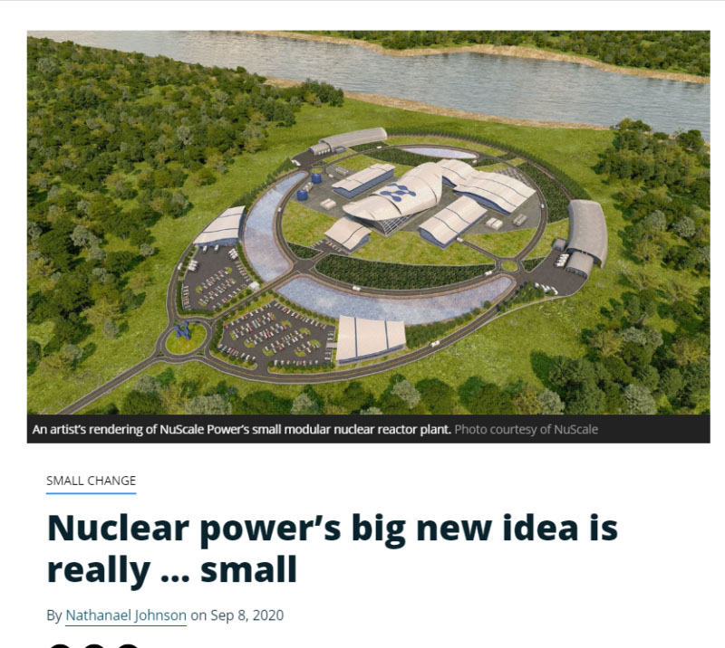 Grist.org網(wǎng)站發(fā)表署名Nathanael Johnson的文章,題目是:Nuclear power’s big new idea is really … small(核能的新思路真的…很?。?