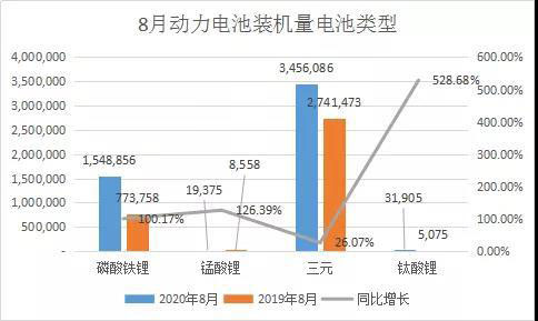 從電池類型來看,8月磷酸鐵鋰電池裝機(jī)量1.55GWh,同比增長100.17%,占電池總裝機(jī)電量的30.33%,主要受益于新能源客車與專用車裝機(jī)量的大幅增長。
