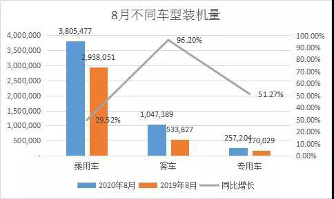 8月新能源客車與新能源專用車產(chǎn)量分別增長118.8%和90.76%,相應(yīng)的動力電池裝機(jī)量依次為1.05GWh和 0.26GWh,同比增速依次為96.2%和51.27%。