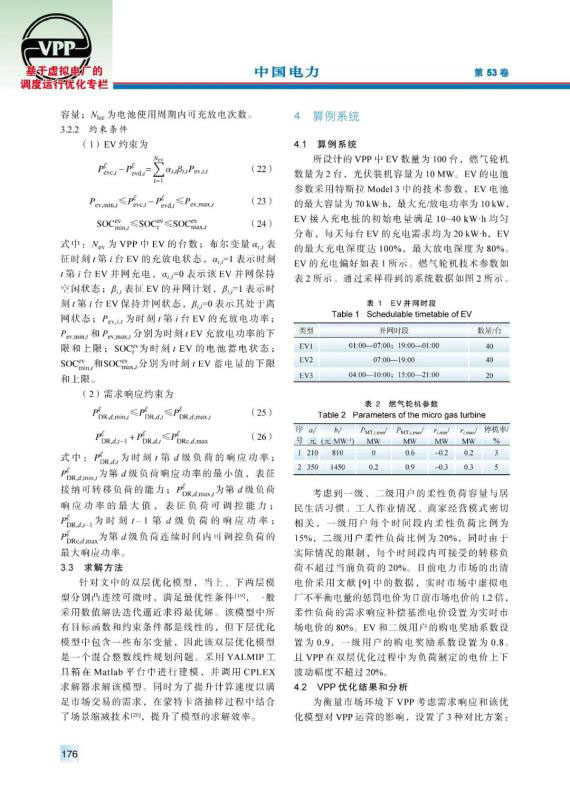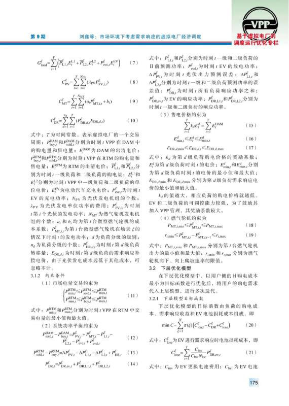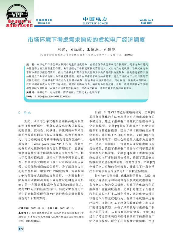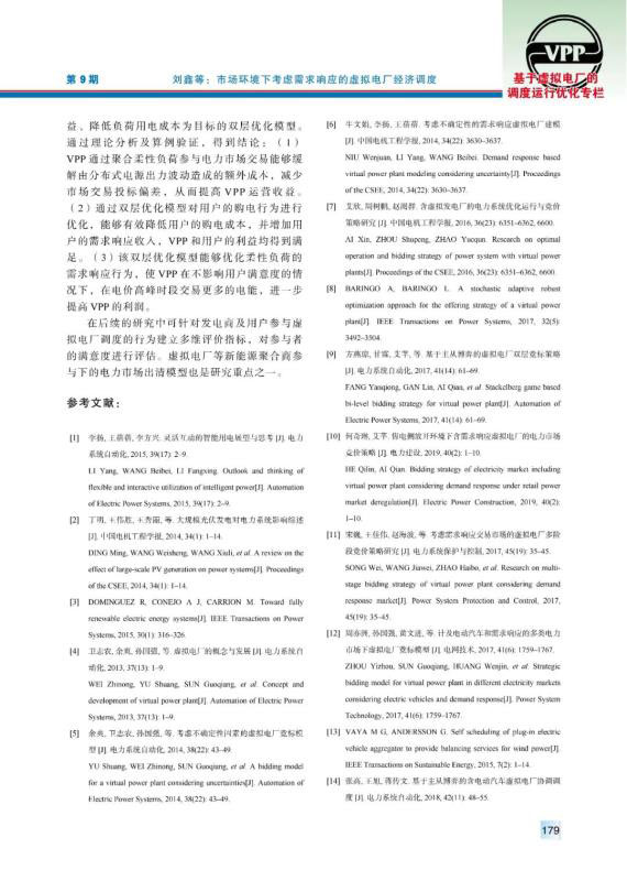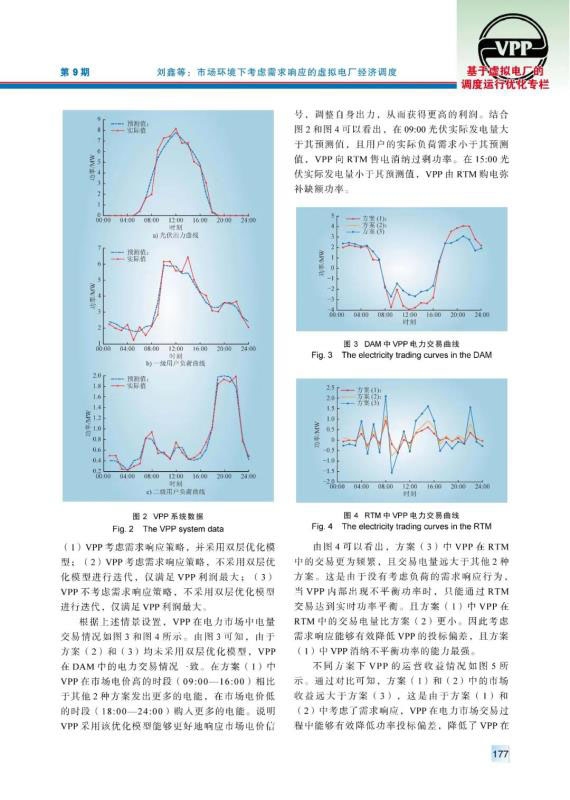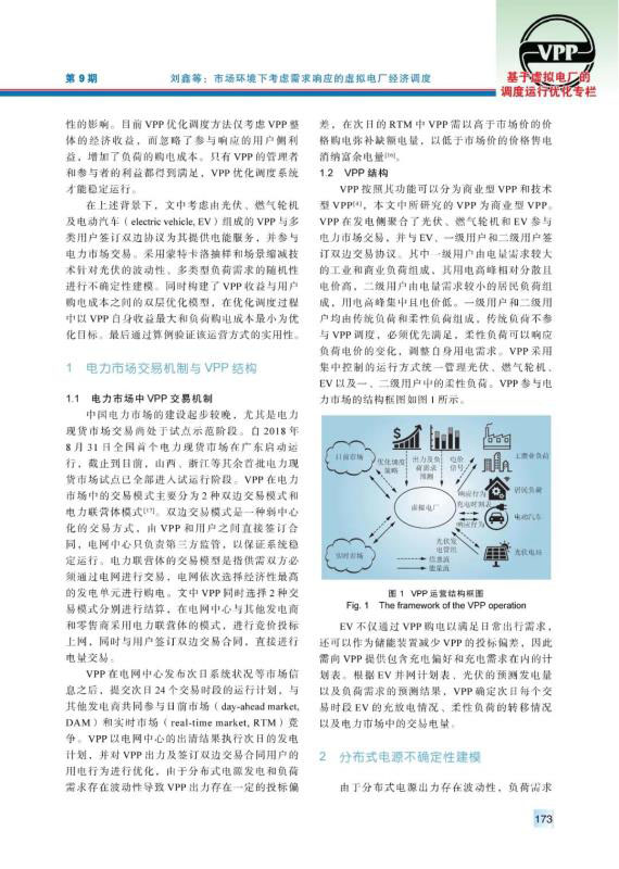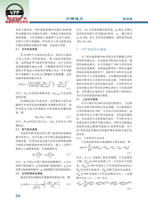 虛擬電廠作為能源互聯(lián)網(wǎng)中的重要組成部分,在聚合分布式能源和用戶側(cè)資源、完善電力市場交易體制等方面發(fā)揮著重要作用。由于虛擬電廠中新能源裝機容量較大,其出力具有隨機性,導(dǎo)致其在電力市場中需要承擔(dān)懲罰費用。提出以虛擬電廠聚合分布式能源為多類負(fù)荷提供電能服務(wù),首先通過蒙特卡洛抽樣建立了分布式電源出力不確定性模型。隨后在考慮需求響應(yīng)的前提下,建立了虛擬電廠與用戶側(cè)的雙層優(yōu)化模型,以虛擬電廠凈收益為上層目標(biāo)函數(shù),綜合考慮市場交易收益、售電收益、發(fā)電成本等因素;以用戶側(cè)購電成本為下層目標(biāo)函數(shù),對用戶的購電行為、響應(yīng)行為進(jìn)行優(yōu)化。最后,通過算例驗證了該模型能夠減少虛擬電廠在電力市場中的投標(biāo)偏差,提高運營收益,并有效降低負(fù)荷的購電成本。