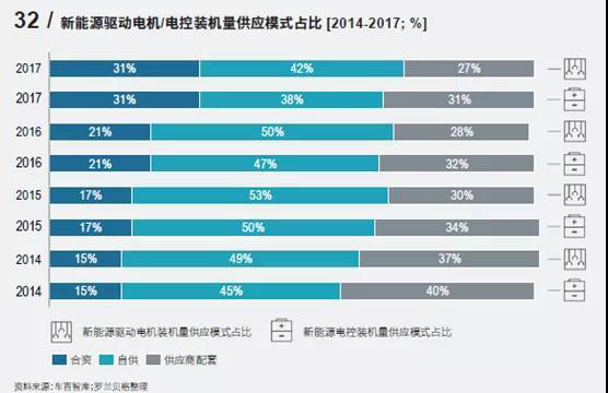 而為了加強對新技術、新產(chǎn)品的掌控,保證零部件供應的安全,越來越多的主機廠在關鍵部件上開始采用自主研發(fā)或者合作共研的方式,減少投資需求并提升研發(fā)能力。根據(jù)報告統(tǒng)計的數(shù)據(jù),自2014年開始,新能源驅動電機、電控中,自研自供一直占有不小的比例。而從變化趨勢來看,供應商配套的占比在穩(wěn)步下降,自研自供比例雖然也略有下降,但是也轉到了合資這一塊。