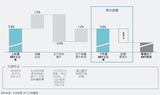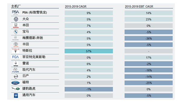2017年以后,隨著全球各主要輕型車市場進入緩慢增長的“新常態(tài)”,市場紅利逐步消失,存量競爭愈發(fā)白熱化。過去野蠻增長下的高利潤空間也被逐漸壓縮,傳統(tǒng)供應鏈增長處在相對乏力的狀態(tài),無論整車廠還是零部件供應商,即便在營收增長的情況下,盈利能力在持續(xù)下滑。大多都出現(xiàn)了利潤下降甚至虧損的情況,嚴重者息稅前利潤(EBIT)年降幅超過10%。