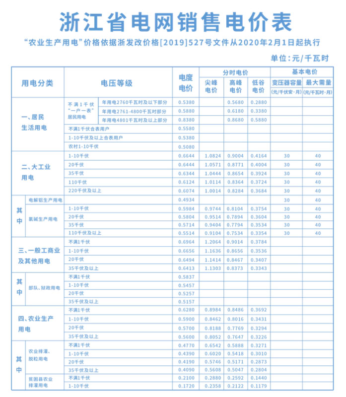 浙江省對(duì)不同種類的用電實(shí)行差別定價(jià):分別為農(nóng)業(yè)用電、居民生活用電、一般工商業(yè)及其他用電、大工業(yè)用電。各個(gè)行業(yè)的用電特性和需求均不同,因此需要結(jié)合實(shí)際采用差異化的定價(jià)方式。