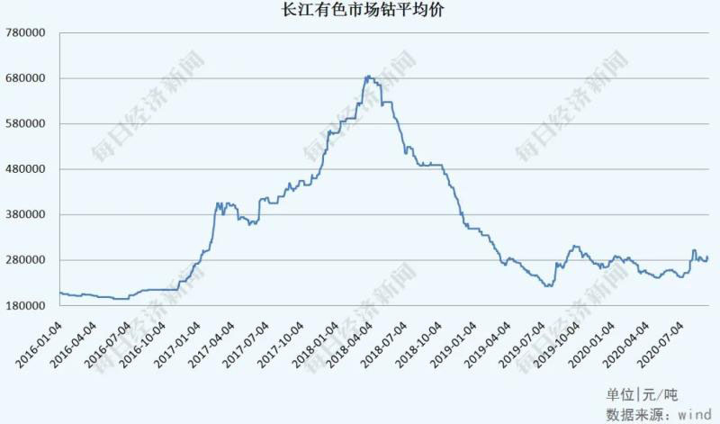 原本就貴,價格還時常劇烈起伏。鈷價曾從2016年的約20萬元/噸,一路飆漲最高至2018年約70萬元/噸高位,此后又回落至20萬元/噸起點。