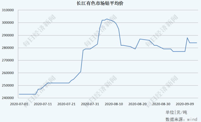 在這個過程中,鈷價一路走高。wind數(shù)據(jù)顯示,7月15日長江有色金屬現(xiàn)貨市場鈷均價為25.2萬元/噸,較月初24.3萬元/噸的價格上漲了3.7%。到了下旬,鈷價更是快速拉漲,7月24日還在25.5萬元/噸,到了8月5日就一度突破30萬元/噸。