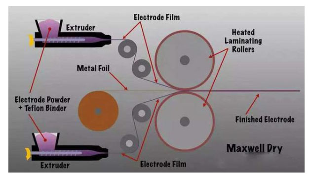 Maxwell干電極工藝更簡單,不使用溶劑,它提供了一個重要但不那么明顯的優(yōu)勢。該過程從電極粉末開始,比如說特斯拉的NCA正極的鋰鎳鈷氧化鋁粉末。將少量(約5-8%)細粉狀PTFE粘合劑與正極粉末混合。然后將混合的正極+粘合劑粉末通過擠壓機形成薄的電極材料帶。