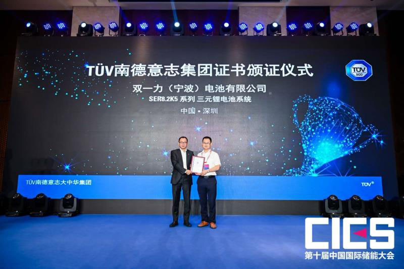 9月24-26日,由中國化學與物理電源行業(yè)協(xié)會主辦、TüV南德意志集團(以下簡稱“TüV南德”)聯(lián)合主辦、中國化學與物理電源行業(yè)協(xié)會儲能應用分會、中國儲能網(wǎng)承辦的第十屆中國國際儲能大會在深圳鵬瑞萊佛士酒店隆重召開。會議吸引了全球儲能行業(yè)眾多領(lǐng)軍企業(yè)參與,共同探討儲能技術(shù)在高安全、低成本、長壽命以及資源再利用全生命周期的研究與布局,推動儲能價值的市場機制建設、推進先進大容量儲能系統(tǒng)技術(shù)在高比例可再生能源電網(wǎng)的規(guī)?;瘧?,有力構(gòu)建以市場為導向的綠色技術(shù)創(chuàng)新體系。9月25日,在儲能安全、標準與檢測分會場上,TüV南德為雙一力(寧波)新能源有限公司(以下簡稱“雙一力”)旗下型號為SER8.2K5系列的儲能電池系統(tǒng)產(chǎn)品頒發(fā)IEC 62619認證證書,TüV南德大中華集團智慧能源事業(yè)部副總裁許海亮、雙一力銷售副總經(jīng)理秦宇峰等一席嘉賓出席了該頒證儀式。此證書的獲得標志著雙一力該系列儲能電池系統(tǒng)產(chǎn)品的安全性能符合國際主流標準的要求,將會對其產(chǎn)品進入歐洲、澳洲等市場帶來更大國際競爭力。