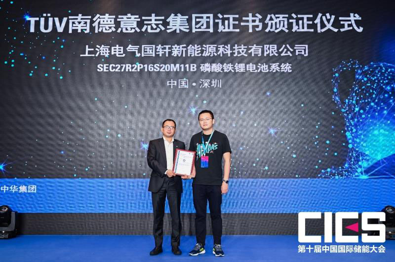 9月24-26日,由中國化學(xué)與物理電源行業(yè)協(xié)會主辦、TüV南德意志集團(以下簡稱“TüV南德”)聯(lián)合主辦、中國化學(xué)與物理電源行業(yè)協(xié)會儲能應(yīng)用分會、中國儲能網(wǎng)承辦的第十屆中國國際儲能大會在深圳鵬瑞萊佛士酒店隆重召開。大會吸引了全球儲能行業(yè)眾多領(lǐng)軍企業(yè)參與,共同探討儲能技術(shù)在高安全、低成本、長壽命以及資源再利用全生命周期的研究與布局,推動儲能價值的市場機制建設(shè)、推進先進大容量儲能系統(tǒng)技術(shù)在高比例可再生能源電網(wǎng)的規(guī)模化應(yīng)用,有力構(gòu)建以市場為導(dǎo)向的綠色技術(shù)創(chuàng)新體系。9月25日在儲能安全、標準與檢測分會場上,TüV南德為上海電氣國軒新能源有限公司(以下簡稱“上海電氣國軒”)型號為SEC27R2P16S20M11B系列的儲能電池系統(tǒng)產(chǎn)品頒發(fā)IEC 62619認證證書,TüV南德大中華集團智慧能源事業(yè)部副總裁許海亮,上海電氣國軒新能源技術(shù)部長葉飛等一席嘉賓出席了該頒證儀式。