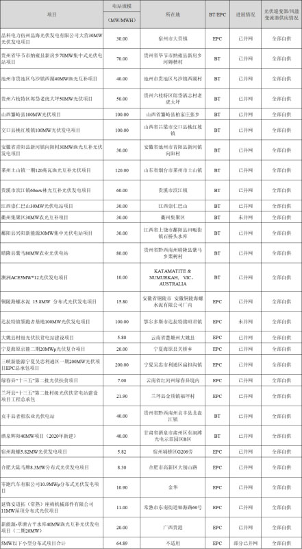 根據(jù)2020年半年報(bào),了解到陽(yáng)光電源的28個(gè)光伏電站以及5MW以下小型分布式項(xiàng)目的相關(guān)情況,這些光伏項(xiàng)目總規(guī)模為1351.41MW(約1.35GW),所有項(xiàng)目的逆變器皆自供;其中除了衢州集聚區(qū)30MW農(nóng)光互補(bǔ)項(xiàng)目和達(dá)拉特旗領(lǐng)跑者基地100MW光伏發(fā)電項(xiàng)目還未并網(wǎng),其他26個(gè)項(xiàng)目全都完成了并網(wǎng),詳情如下: