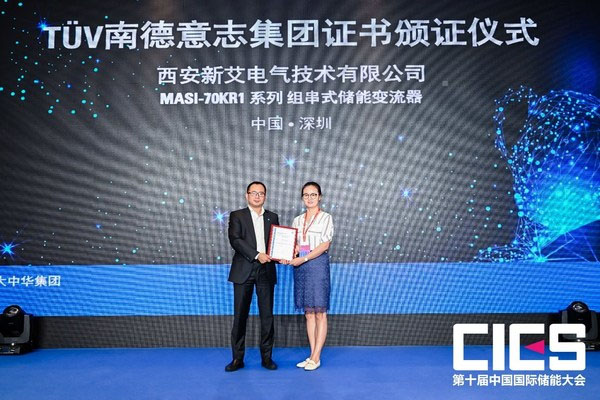 中國(guó)儲(chǔ)能網(wǎng)訊:9月24-26日,由中國(guó)化學(xué)與物理電源行業(yè)協(xié)會(huì)主辦、TUV南德意志集團(tuán)(以下簡(jiǎn)稱“TUV南德”)聯(lián)合主辦、中國(guó)化學(xué)與物理電源行業(yè)協(xié)會(huì)儲(chǔ)能應(yīng)用分會(huì)、中國(guó)儲(chǔ)能網(wǎng)承辦的第十屆中國(guó)國(guó)際儲(chǔ)能大會(huì)在深圳鵬瑞萊佛士酒店隆重召開(kāi)。大會(huì)吸引了全球儲(chǔ)能行業(yè)眾多領(lǐng)軍企業(yè)參與,共同探討儲(chǔ)能技術(shù)在高安全、低成本、長(zhǎng)壽命以及資源再利用全生命周期的研究與布局,推動(dòng)儲(chǔ)能價(jià)值的市場(chǎng)機(jī)制建設(shè)、推進(jìn)先進(jìn)大容量?jī)?chǔ)能系統(tǒng)技術(shù)在高比例可再生能源電網(wǎng)的規(guī)?;瘧?yīng)用,有力構(gòu)建以市場(chǎng)為導(dǎo)向的綠色技術(shù)創(chuàng)新體系。9月25日,在儲(chǔ)能安全、標(biāo)準(zhǔn)與檢測(cè)分會(huì)場(chǎng)上,TUV南德為西安新艾電氣技術(shù)有限公司(以下簡(jiǎn)稱“西安新艾電氣”)組串式儲(chǔ)能變流器MASI-70KR1系列頒發(fā)TUV SUD認(rèn)證證書(shū)。TUV南德大中華集團(tuán)智慧能源事業(yè)部副總裁許海亮,西安新艾電氣市場(chǎng)營(yíng)銷(xiāo)部副總經(jīng)理周文姣等一席嘉賓出席了該頒證儀式。