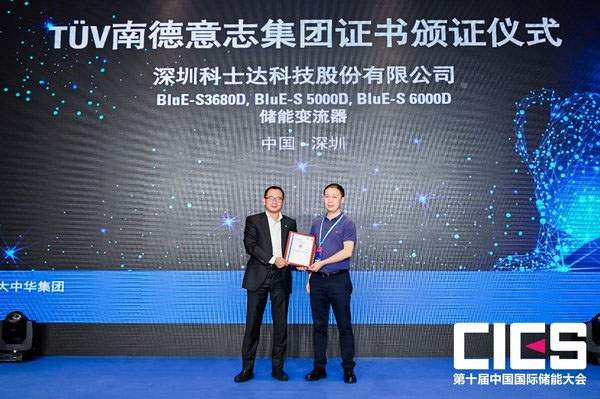 中國(guó)儲(chǔ)能網(wǎng)訊:9月24-26日,由中國(guó)化學(xué)與物理電源行業(yè)協(xié)會(huì)主辦,TUV南德意志集團(tuán)(以下簡(jiǎn)稱“TUV南德”)聯(lián)合主辦,中國(guó)化學(xué)與物理電源行業(yè)協(xié)會(huì)儲(chǔ)能應(yīng)用分會(huì)、中國(guó)儲(chǔ)能網(wǎng)承辦的第十屆中國(guó)國(guó)際儲(chǔ)能大會(huì)在深圳鵬瑞萊佛士酒店隆重召開。大會(huì)吸引了全球儲(chǔ)能行業(yè)眾多領(lǐng)軍企業(yè)參與,共同探討儲(chǔ)能技術(shù)在高安全、低成本、長(zhǎng)壽命以及資源再利用全生命周期的研究與布局,推動(dòng)儲(chǔ)能價(jià)值的市場(chǎng)機(jī)制建設(shè)、推進(jìn)先進(jìn)大容量?jī)?chǔ)能系統(tǒng)技術(shù)在高比例可再生能源電網(wǎng)的規(guī)?;瘧?yīng)用,有力構(gòu)建以市場(chǎng)為導(dǎo)向的綠色技術(shù)創(chuàng)新體系。9月25日,在儲(chǔ)能安全、標(biāo)準(zhǔn)與檢測(cè)分會(huì)場(chǎng)上,TUV南德為深圳科士達(dá)科技股份有限公司(以下簡(jiǎn)稱“深圳科士達(dá)”)BluE系列儲(chǔ)能變流器頒發(fā)TUV SUD安全認(rèn)證證書。TUV南德大中華集團(tuán)智慧能源事業(yè)部副總裁許海亮,深圳科士達(dá)認(rèn)證部總監(jiān)李彬等一席嘉賓出席了該頒證儀式。該證書的獲得,為科士達(dá)進(jìn)一步進(jìn)軍儲(chǔ)能國(guó)際市場(chǎng)奠定了良好的基礎(chǔ)。