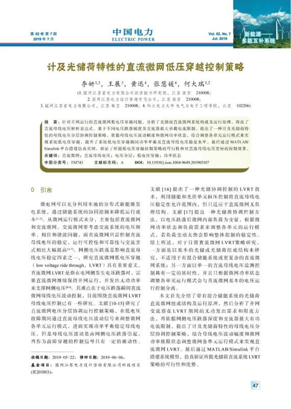 LI Yan, WANG Zhan, HUANG Xun, et al. LVRT control strategy for DC microgrids considering the characteristics of PV/storage/load[J]. Electric Power, 2019, 52(7): 47-54.