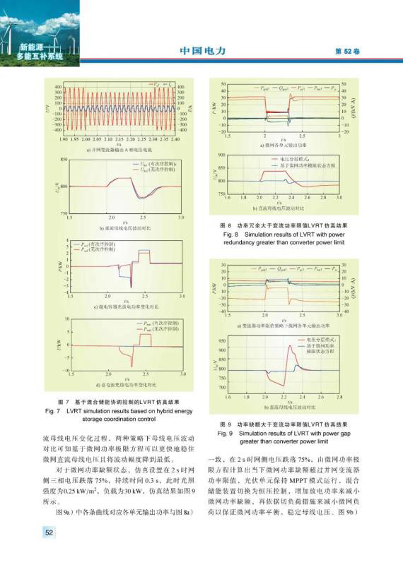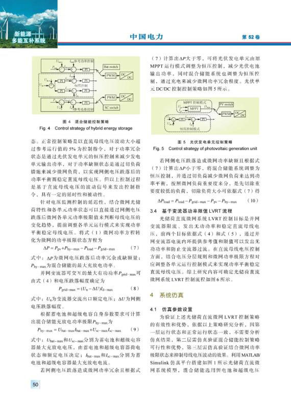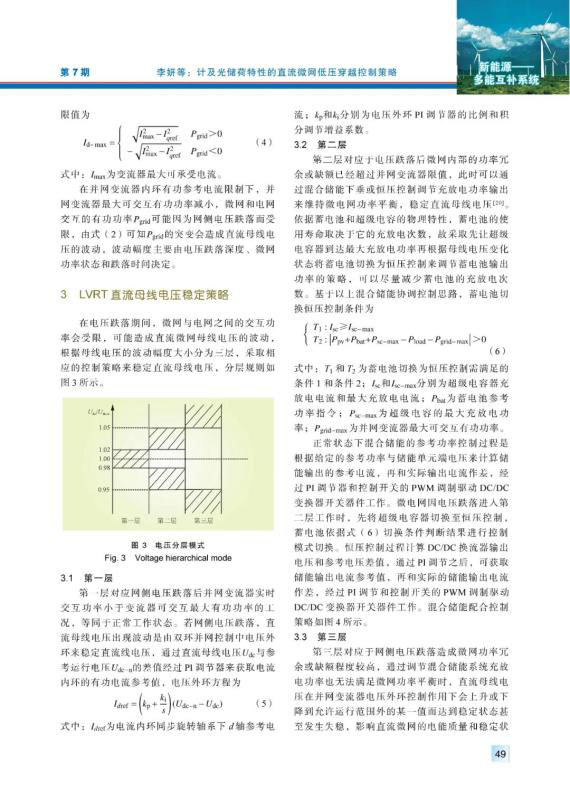 摘要:針對(duì)并網(wǎng)運(yùn)行的直流微網(wǎng)低電壓穿越問(wèn)題,分析了光儲(chǔ)荷直流微網(wǎng)系統(tǒng)構(gòu)成及運(yùn)行原理,得出了直流母線電壓解析表達(dá)式?;诓煌妷旱浞燃白兞髌髯畲蟪休d電流限制,提出了一種計(jì)及光儲(chǔ)荷特性的母線電壓分層協(xié)調(diào)控制策略,依據(jù)母線電壓波動(dòng)幅度和微網(wǎng)功率狀態(tài),綜合調(diào)整各單元運(yùn)行模式來(lái)實(shí)現(xiàn)系統(tǒng)低電壓穿越,提升了系統(tǒng)低電壓穿越期間功率平衡及直流母線電壓穩(wěn)定水平。最后通過(guò)MATLAB/Simulink平臺(tái)搭建仿真實(shí)例,驗(yàn)證了所提低電壓穿越控制策略的可行性和對(duì)直流母線電壓更好的控制效果。