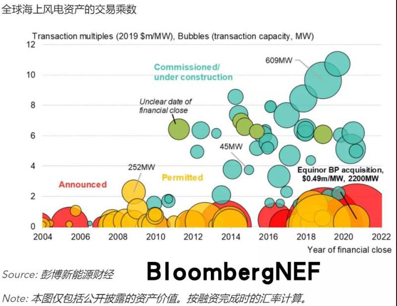 BP以11億美元收購了Equinor美國海上風(fēng)電資產(chǎn)組合的50%股權(quán),其中包括兩個(gè)海上風(fēng)電租約:一個(gè)在麻省,另一個(gè)在紐約州。兩者面積合計(jì)842平方公里,BP聲稱兩個(gè)租賃區(qū)可以容納4.4GW的海上風(fēng)電項(xiàng)目。兩個(gè)租賃區(qū)將按項(xiàng)目劃分,參與各州的海上風(fēng)電競(jìng)價(jià)。目前兩個(gè)租賃區(qū)尚無獲選容量,所以BP本次收購的資產(chǎn)尚處早期階段,收購交易乘數(shù)與以往處于類似階段的的其他資產(chǎn)組合收購是一致的。