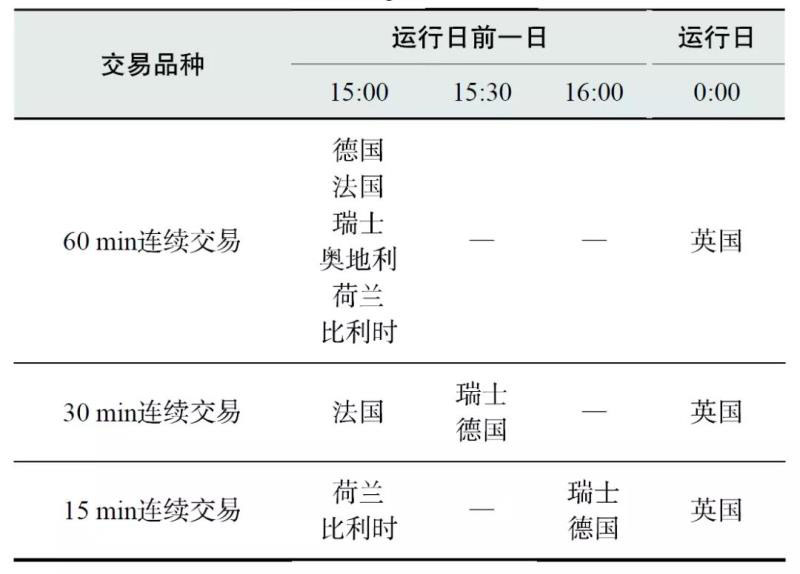日內(nèi)連續(xù)交易市場針對各國交易體系的特點(diǎn)共設(shè)置了60分鐘連續(xù)交易、30分鐘連續(xù)交易及15分鐘連續(xù)交易三個(gè)交易產(chǎn)品,所有產(chǎn)品于運(yùn)行日前一日15:00時(shí)開始,連續(xù)交易直至運(yùn)行日各國市場交割前。市場交易時(shí)序如表1所示。