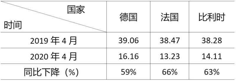 一是總體用電需求快速下降,發(fā)電供給相對過剩,各國交易電價普遍下降。國際能源署預(yù)計2020年全球能源需求下降6%,是2008年全球金融危機時能源需求量下降的7倍;疫情期間全球電力消費下降20%,預(yù)計全年全球用電需求將下降5%,是1930年代大蕭條以來的最大降幅。德國、法國、比利時4月電力批發(fā)市場日前平均交易價格較同期下降超過50%,8天出現(xiàn)負電價,最低跌至-76.29歐元/兆瓦時(如表1)。