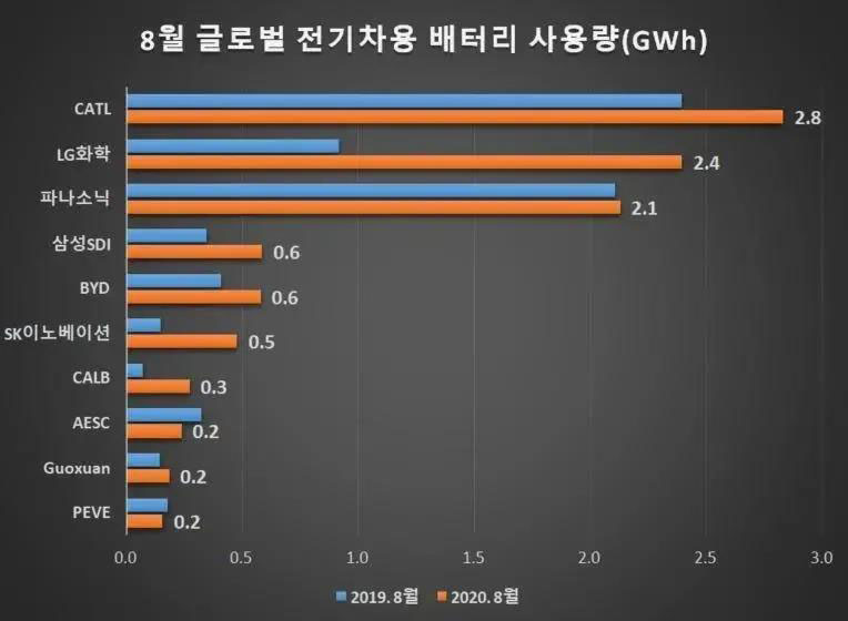 不過(guò),從今年1-8月的整體數(shù)據(jù)來(lái)看,LG化學(xué)還是以15.9GWh裝機(jī)量位居全球榜首,寧德時(shí)代則以15.5GWh,屈居第二,排在后面的分別是松下電池、三星SDI、SKI和比亞迪等電池生產(chǎn)企業(yè)。