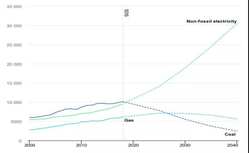 圖4 IEA SDS情景下全球天然氣發(fā)電量變化趨勢(單位:太瓦時(shí))