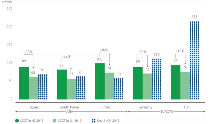 制約天然氣發(fā)電產(chǎn)業(yè)發(fā)展的首要因素是發(fā)電燃料成本高,影響到天然氣發(fā)電的優(yōu)勢。近年來,天然氣價(jià)格的下降趨勢使之與燃煤發(fā)電相比逐步具備了競爭力,這對(duì)亞洲的氣電發(fā)展至關(guān)重要,因?yàn)閬喼迋鹘y(tǒng)上是全球天然氣價(jià)格最高的地區(qū),且該地區(qū)的煤炭價(jià)格最低。2019年第一季度,日本和韓國天然氣發(fā)電的平準(zhǔn)化度電成本(LCOE)已低于燃煤發(fā)電。在中國,天然氣發(fā)電的LCOE仍高于燃煤發(fā)電,但兩者之間的差距縮?。ㄒ妶D3)。