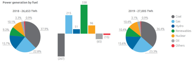 具體到地區(qū)/國家層面,2019年全球天然氣發(fā)電量增量主要來自美國、中國和歐洲地區(qū)。其中,美國天然氣發(fā)電量1700.9太瓦時(shí),同比增長121.6太瓦時(shí),增幅7.7%;歐洲地區(qū)天然氣發(fā)電量768.1太瓦時(shí),同比增長38.2太瓦時(shí),增幅5.2%;中國天然氣發(fā)電量236.5太瓦時(shí),同比增長21太瓦時(shí),增幅9.7%。與2018年相比,中國天然氣發(fā)電量增長有所放緩。歐洲地區(qū)部分國家天然氣發(fā)電量的強(qiáng)勁增長受“煤改氣”帶動(dòng)。在日本,2019年天然氣發(fā)電量362.4太瓦時(shí),同比減少24.5太瓦時(shí),降幅6.3%,主要原因是核能發(fā)電量增加和總體電力需求下降。