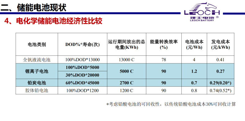 這是從經(jīng)濟(jì)性上比較的,發(fā)電成本只是純電池,不包括系統(tǒng)。如果要算系統(tǒng),按最后的成本可能要乘2-3,也不包括充電。目前看來(lái)鋰離子電池和鉛炭電池有優(yōu)勢(shì)。鉛炭電池雖然慢慢被取代,但到目前為止還是唯一一個(gè)能夠循環(huán)利用的,其他的體系的電池還都做不到,所以它還仍然有生命力。
