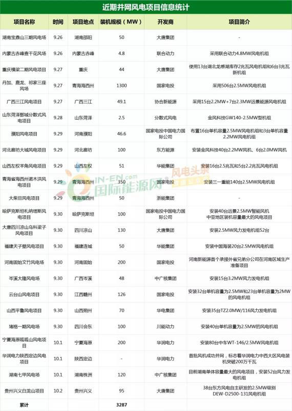 10月9日不完全統(tǒng)計(jì),在國(guó)慶節(jié)前后,各大風(fēng)電投資商累計(jì)完全并網(wǎng)或首批風(fēng)機(jī)并網(wǎng)23個(gè)項(xiàng)目,項(xiàng)目累計(jì)裝機(jī)容量達(dá)到3287MW。