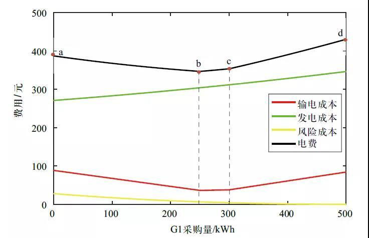 在霍特林模型下綜合考慮發(fā)電成本、風(fēng)險(xiǎn)成本和輸電成本,交易方案產(chǎn)生的實(shí)際電費(fèi)如圖4所示。隨著用戶在G1處所購(gòu)電量增加,風(fēng)險(xiǎn)成本逐步降低,總電費(fèi)呈現(xiàn)先降低后升高的趨勢(shì)。相較于發(fā)電成本,輸電成本占比小,且不僅取決于交易雙方,也受實(shí)際電網(wǎng)線路的制約,仿真難度相對(duì)較大,所以在電力交易中經(jīng)常被簡(jiǎn)化忽略。但若只考慮發(fā)電成本,會(huì)從G2購(gòu)買(mǎi)全部電力,雖然發(fā)電成本最低僅271元,但電能傳輸引起的輸電成本較高,增加了總費(fèi)用。相比之下,雖然方案b的發(fā)電成本略高為305元,但其極大節(jié)約了輸電成本,最終降低了總費(fèi)用至347元。因此,電力交易中對(duì)輸電成本的考量很有必要。