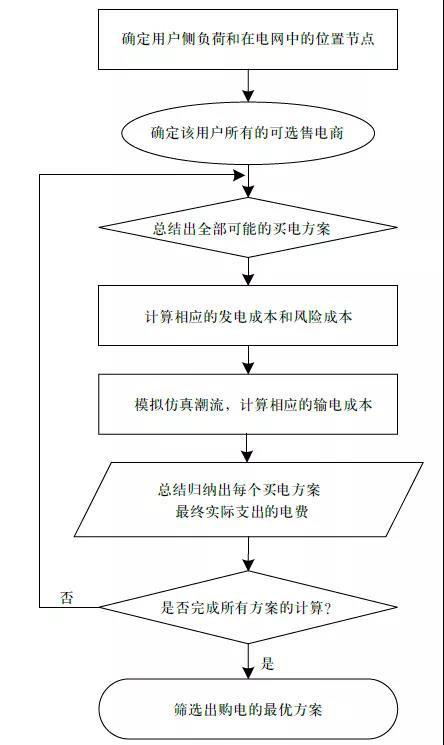 在交易開(kāi)始前,先確定用戶的負(fù)荷需求及其在電網(wǎng)中的具體位置,根據(jù)位置確定潛在可選擇的發(fā)電商,推導(dǎo)出可能的交易策略。為了篩選出經(jīng)濟(jì)最佳方案,需要分別模擬每種策略的發(fā)電成本、風(fēng)險(xiǎn)成本和輸電成本。發(fā)電成本通過(guò)綜合所選發(fā)電商的發(fā)電成本和相應(yīng)采購(gòu)量計(jì)算。風(fēng)險(xiǎn)成本需要確定所選發(fā)電商是否存在可再生能源,并根據(jù)其相應(yīng)的采購(gòu)量計(jì)算。輸電成本需先仿真電路潮流,在相應(yīng)線路潮流的基礎(chǔ)上綜合整合而得。
