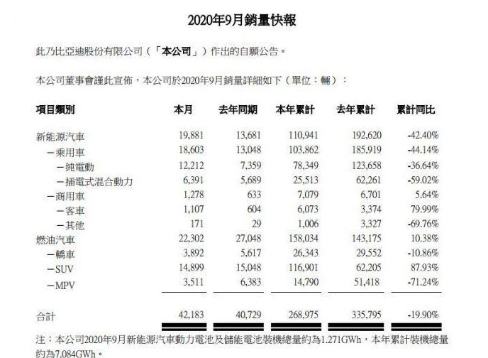 比亞迪表示,今年前9個月,該公司的新能源汽車銷量累計為11.0941萬輛,與去年前9個月的19.262萬輛相比,同比下降42.4%。