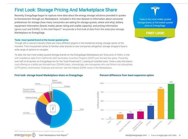 太陽(yáng)能屋頂和儲(chǔ)能系統(tǒng)在線比較購(gòu)物市場(chǎng)EnergySage最近發(fā)布的報(bào)告揭示了一些令人難以置信的東西。盡管特斯拉能源公司低調(diào)發(fā)展,但Powerwall 2實(shí)際上已經(jīng)主導(dǎo)了美國(guó)的家用電池存儲(chǔ)市場(chǎng),而且競(jìng)爭(zhēng)遠(yuǎn)遠(yuǎn)談不上激烈。