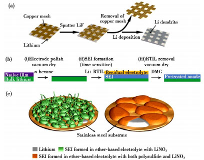 圖3 各種人工SEI膜:(a)氟化鋰作為人工SEI膜改性鋰金屬負(fù)極;(b)利用離子液體電解質(zhì)進行化學(xué)預(yù)處理制備人工SEI膜的過程;(c)加入添加劑改性電解液的鋰沉積形貌示意圖