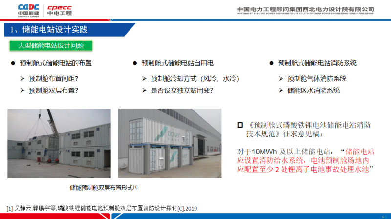 第一個問題是預制艙式儲能電站的布置間距問題,這個問題已經(jīng)困擾我們很久了。關(guān)于儲能集裝箱之間的防火間距。預制艙能否可以采用雙層布置。第二個問題是隨著大型儲能電站越來越大,系統(tǒng)集裝箱數(shù)目是很大的,如果是高溫地區(qū)可能會采用一些水冷方案。這樣將近數(shù)百個集裝箱集成在一起,站用電是不可忽視的量,站用電是否需要設獨立站用變,是否可以由集裝箱來承擔一部分自己的自耗電。第三個是預制艙式儲能電站消防系統(tǒng)問題,儲能集裝箱內(nèi)一般是帶氣體消防,但在儲能集裝箱外儲能區(qū)域是否設置水消防系統(tǒng),還沒有明確定論。這里列出了中電聯(lián)一個團體標準,《預制艙式磷酸鐵鋰電池儲能電站消防技術(shù)規(guī)范》,它對上面幾個問題有了比較明確的答復。第一,布置間距,電池預制箱間距不小于3米,如果設防火墻,對防火墻尺寸有一定要求。對于儲能的布置方式,建議單層布置,雙層布置還有很多問題目前還沒有搞清楚。第二,對于大于10MWh的儲能電站要設置消防水系統(tǒng)。對于消防給水系統(tǒng)我們設計單位目前還比較困惑,因為國家電網(wǎng)公司有一個企業(yè)標準《儲能電站設計技術(shù)導則》,明確提出當儲能系統(tǒng)發(fā)生火災時,不能采用水噴淋方式滅火的。