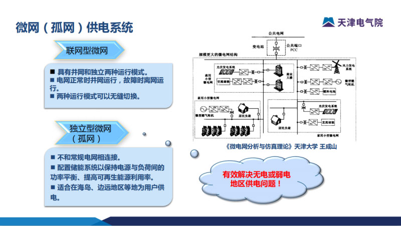我們跟天津大學(xué)的王教授有非常深度的合作,對于電網(wǎng)的分類,一般就是聯(lián)網(wǎng)型或者是獨立型。聯(lián)網(wǎng)型就是跟大電網(wǎng)有PCC節(jié)點,但是也具有獨立運行的能力。在電網(wǎng)建成的時候,并網(wǎng)進行,離網(wǎng)的時候快速的切換。我們更多的關(guān)注是獨立型的微網(wǎng),有別于常規(guī)電網(wǎng),獨立型微電網(wǎng)相對比較弱,需要配置儲能作為符合和電源之間的功率平衡,提高新能源的滲透率。這是一種有效解決無電或者是弱電的技術(shù)綜合性的解決方案。